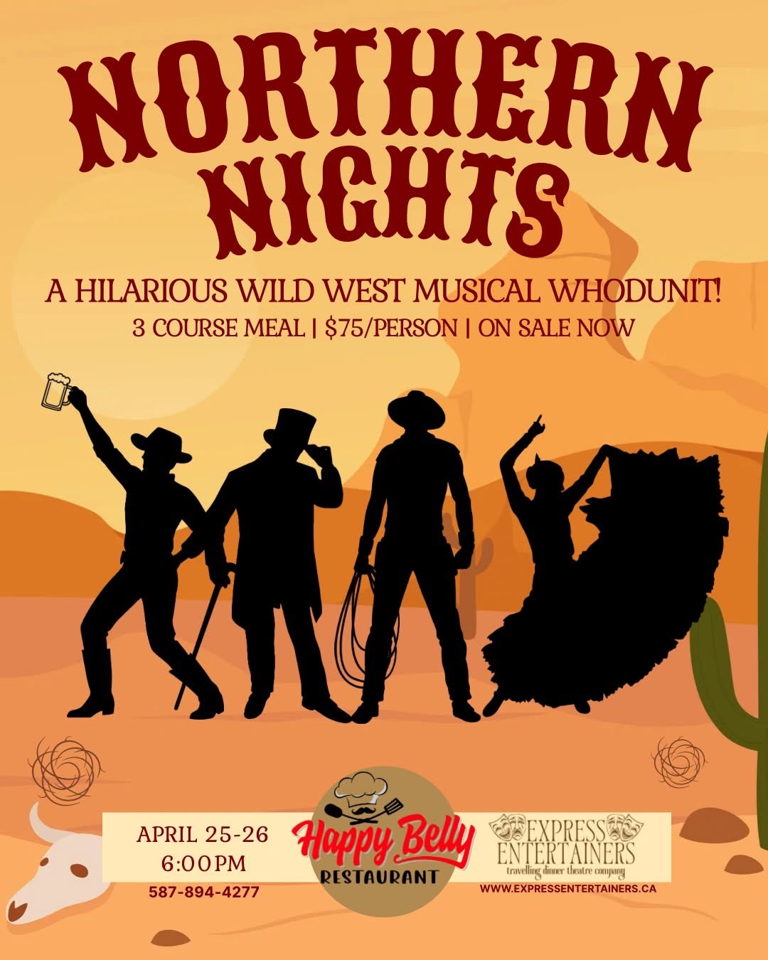 Get ready for a night of side-splitting laughter at the Happy Belly Grill & Bar. Express Entertainers is bringing their traveling dinner theatre to town for a Wild West Musical Whodunit!